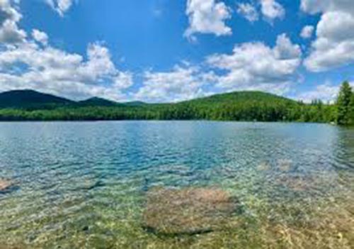 This beautiful mountain pond right near our home is where we swim in summer. We bring pet goose Gabby and she loves to float around with 'goose dad'!