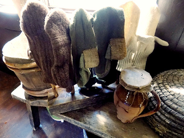 On the wall shelf, an authentic 17thc. replica hand embroidered coif that was done for Plimoth Plantation and took the lady 2 years to embroider. It was on display there for many years. Plimoth Plantation decided to sell it many years ago and told us we 'were the ones to have it'.