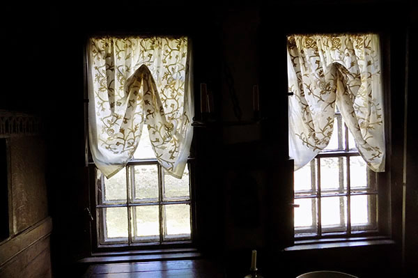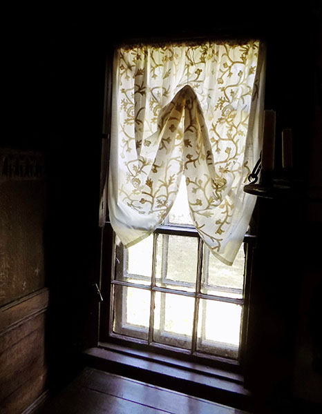 We chose a period correct fabric for the bedhangings Mary made by hand. (See more about that below). The print and the rich colors make us happy!