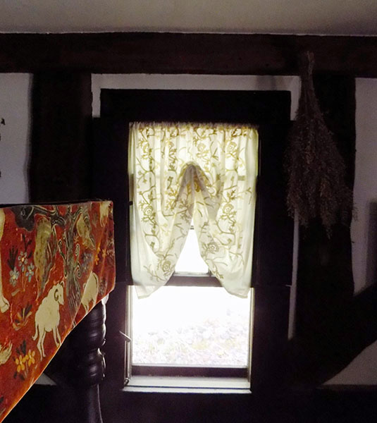 Unlike the overly-tall and heavily carved tester beds of the period that would have been found only in a castle and never in a yeomans or merchant's home, we love our low, perfectly appropriate and original 17thc. English bed. We've never seen one we like as well~We love it's headboard candle shelf.